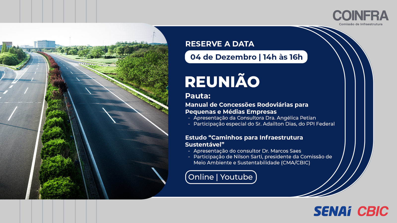 Já o estudo o Caminhos para a Infraestrutura Sustentável reúne tendências, soluções ambientalmente responsáveis e boas práticas aplicadas em projetos pelo país. As duas publicações serão lançadas durante encontro da Comissão de Infraestrutura da Câmara Brasileira da Indústria da Construção (COINFRA/CBIC). A apresentação será transmitida ao vivo pelo canal da entidade no YouTube, das 14h às 16h.