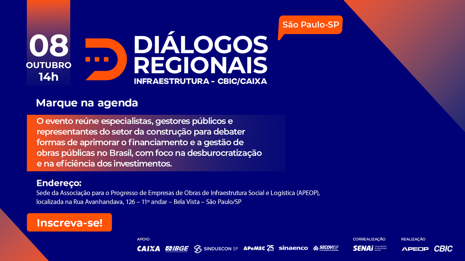Especialistas, gestores públicos e representantes do setor da construção se reúnem nesta quarta-feira (8), em São Paulo, para a oitava edição do “Diálogos Regionais CBIC-Caixa – Infraestrutura”. Iniciativa da Comissão de Infraestrutura da Câmara Brasileira da Indústria da Construção (CBIC), o evento vai debater como aperfeiçoar o financiamento e a gestão de obras públicas no Brasil.