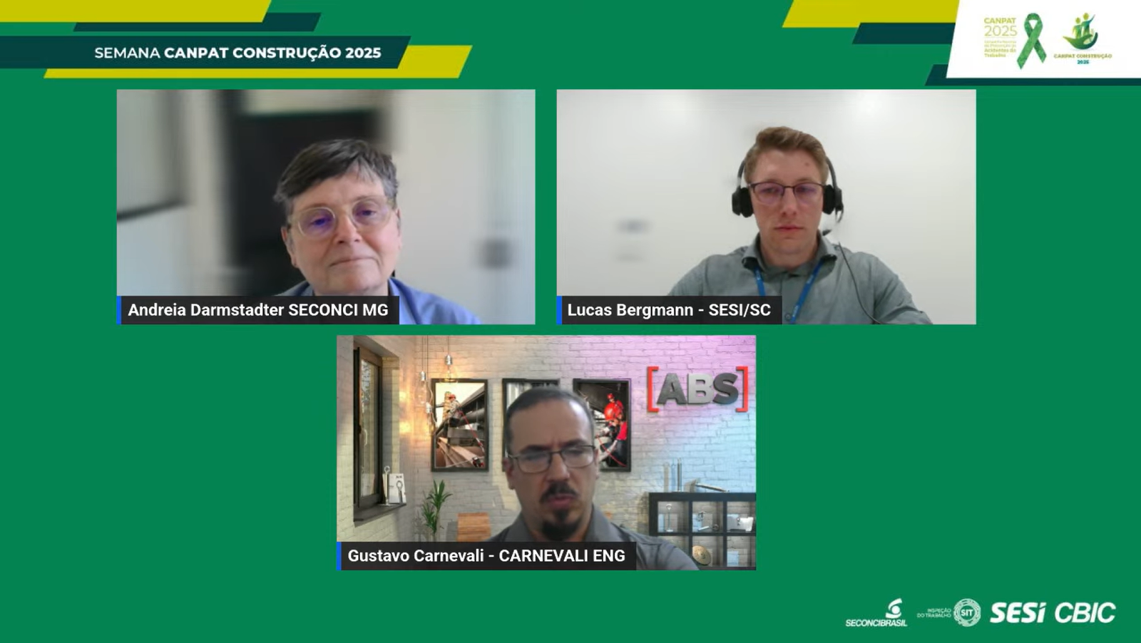 Mediado por Andreia Kaucher, engenheira de segurança e supervisora do Departamento de Segurança do Trabalho do Seconci-MG, o encontro contou com apresentações de Gustavo Carnevali, mestre em Engenharia Mecânica e especialista em sistemas de proteção contra quedas, e Lucas Bergman, engenheiro do Sesi-SC. A iniciativa é promovida pela Câmara Brasileira da Indústria da Construção (CBIC), em parceria com o Serviço Social da Indústria (Sesi), a Secretaria de Inspeção do Trabalho (SIT/MTE) e o Seconci Brasil.